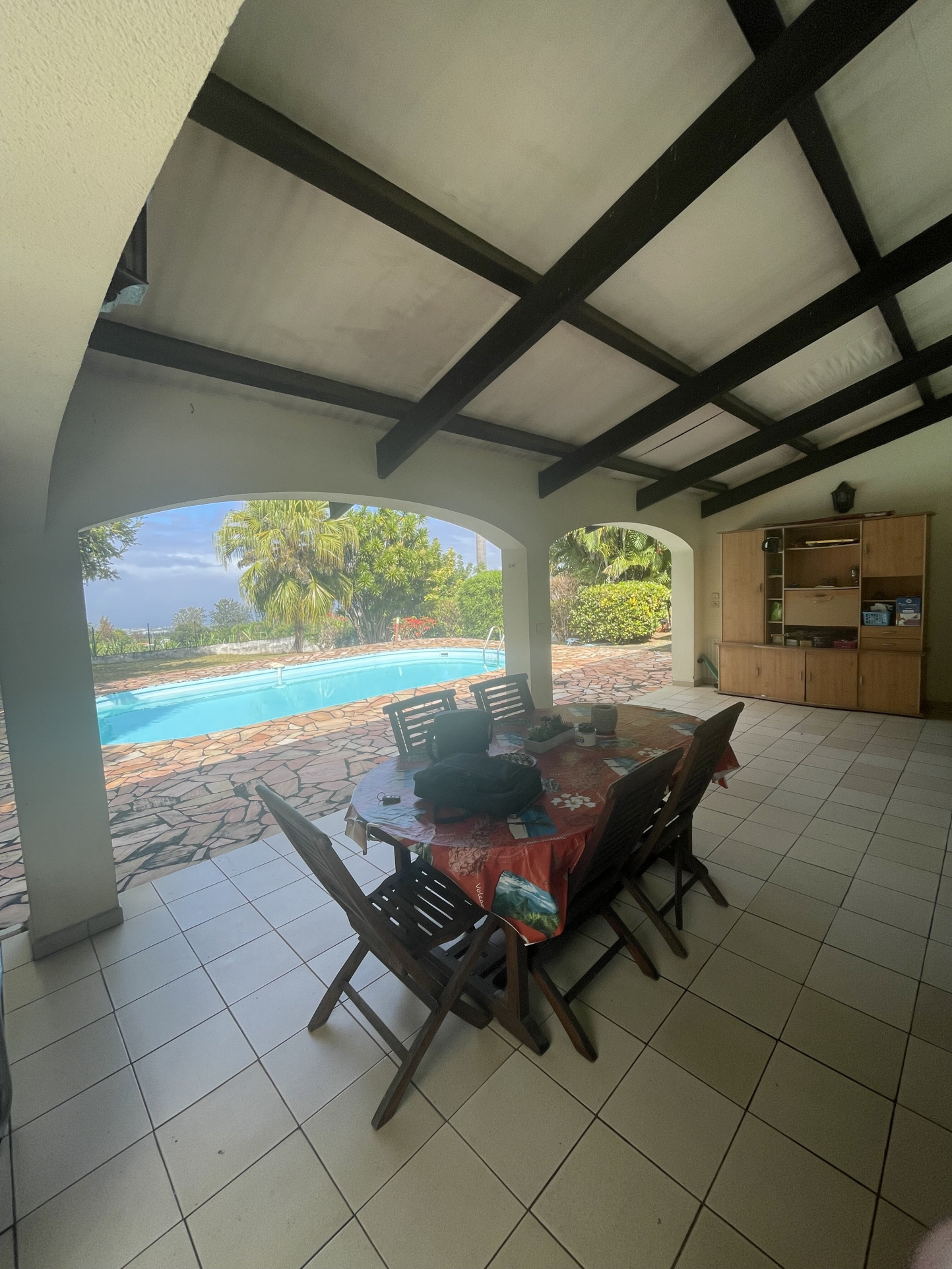 L'agence NATO IMMOBILIER 974 vous propose d'acquérir une maison de type 4/5 de 160 m2, idéalement située proche des commerces et des écoles de la ravine des cabris. Cette maison située dans un lotissement prisé, elle est édifiée sur un terrain de 826 m2 arboré avec piscine 8X4 au sel. Elle se compose en rdc d'un grand salon séjour avec une belle hauteur sous plafond, une cuisine équipée et ouverte, une chambre parentale avec salle de bain privative, une deuxième chambre de belle surface, une salle de bains avec baignoire, wc indépendant. À l'étage, se trouve une grande mezzanine pouvant être transformée en chambre, et un espace parental avec salle d'eau et dressing à aménager. Cette maison construite dans les années 1990, a besoin d'être remise au goût du jour avec quelques travaux à prévoir. Elle se situe dans un lotissement en copropriété avec des charges annuelles de 100 EUR. Taxe foncière 3716 EUR. Maison située proche de la quatre voies avec accès en moins de cinq minutes.